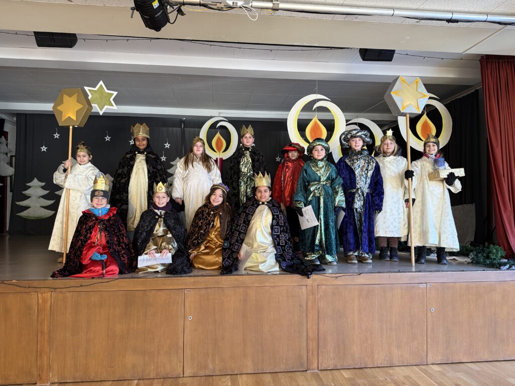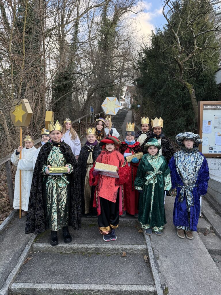 Am Sonntagnachmittag, den 4. Januar war es wieder so weit. Der Brauch des Sternsingens wird in Birsfelden schon seit vielen Jahren von den Schüler:innen der 4. und 5. Klasse durchgeführt. Um 14.30h trafen sich im Fridolinsheim 13 Kinder. Zuerst wurden der Text und die Lieder nochmals geprobt, anschliessend die wunderschönen Königskleider und Engelsgewänder angezogen. Und schon bald ging es los durch die Strassen in Birsfelden. In Gruppen aufgeteilt besuchten die Sternsinger bei winterlichen Temperaturen die angemeldeten Familien. Vor der Haustüre oder in den warmen Stuben wurden der Text und die Lieder vorgetragen und der Segen für das neue Jahr überbracht.