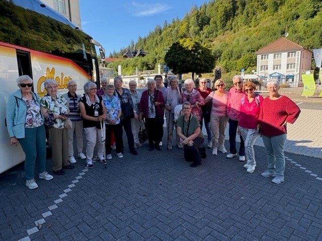 Am 3. September 25 führte der Herbstausflug der katholischen Frauengemeinschaft nach Schauinsland. Es waren 32 Personen dabei. Die Fahrt führte uns via deutsche Autobahn nach Freiburg in Breisgau und weiter zur Talstation der Schauinslandbahn. In kleinen Gondeli genossen wir die Fahrt hinauf auf den Berg. Und auch das Wetter wurde immer wie besser. Oben marschierten einige bis zum Gipfel und waren überwältigt über die tolle Rundumaussicht – das Rheintal, der Schwarzwald, die Vogesen und in weiter Ferne entdecken wir die Schneeberge der Alpen. Das Mittagessen nahmen wir in Restaurant bei der Bergstation ein. In der Zwischenzeit hatte unser Bus auch die Bergstrecke erklommen, so konnten wir direkt dort einsteigen und weiter ging die Fahrt in Richtung Todtnau, über den Feldberg, entlang dem Schluchsee nach St. Blasien. Dort besuchten wir den wunderbaren Dom, gebaut 1783. Es ist der grösste Kuppelbau nördlich der Alpen mit einer Höhe von 62 Metern. St. Blasien ist auch bekannt für schöne Cafes. Das liessen wir uns nicht entgegen und viele von uns genossen auch ein Stück Schwarzwäldertorte. Schon war es wieder Zeit für die Heimfahrt, wieder bei schönstem Wetter brachte unser Chauffeur uns gut nach Birsfelden zurück.
