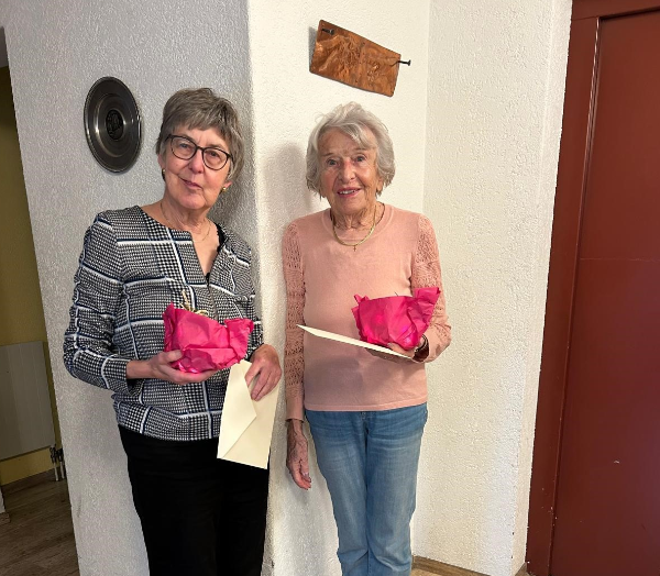 Viele freiwillige HelferInnen engagieren sich jahrzehntelang für unsere Gäste des Mittagstisches im Fridolinsheim. Mit ihrem jahrelangen Da-Sein verschenken sie ihre kostbare Zeit für andere Menschen und ermöglichen damit wertvolle Begegnungen und bringen Abwechslung in den Alltag von vielen Seniorinnen und Senioren. Zwei von ihnen sind dieses Jahr Trudy Urech und Charlotte Müller-Schier. Trudy Urech ist vor 10 Jahren als Freiwillige in die Kochgruppe gestossen und hat tatkräftig beim Rüsten, Kochen, Tischdecken, Einkassieren und Abwasch/Reinigung mitgeholfen. Charlotte Müller-Schier hat vor 5 Jahren ihr Ehrenamt als Fahrerin begonnen und bringt und holt unsere gehbehinderten Gäste, damit diese auch am Mittagstisch teilnehmen können.