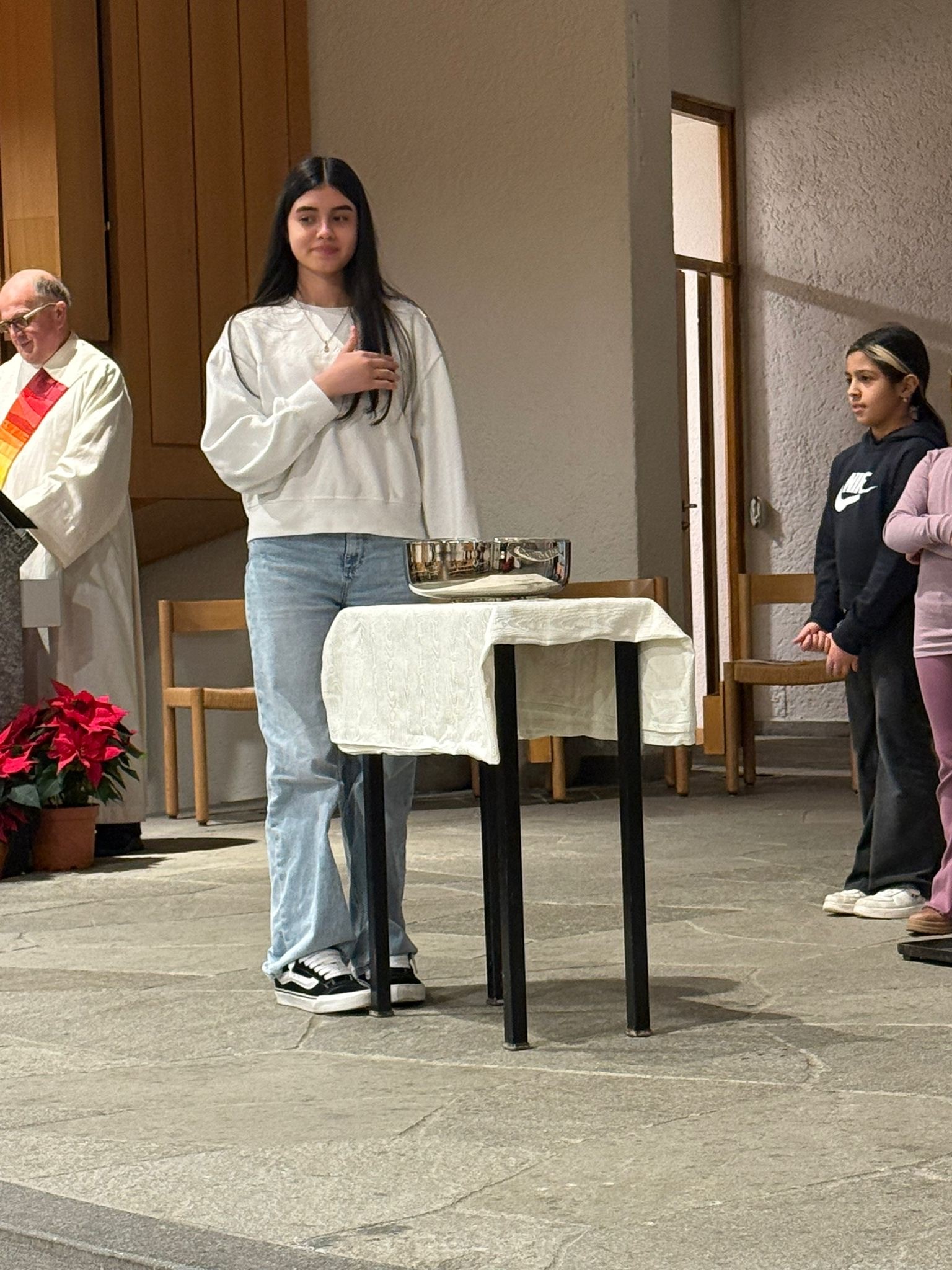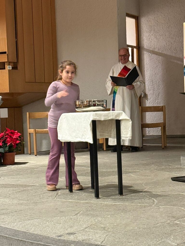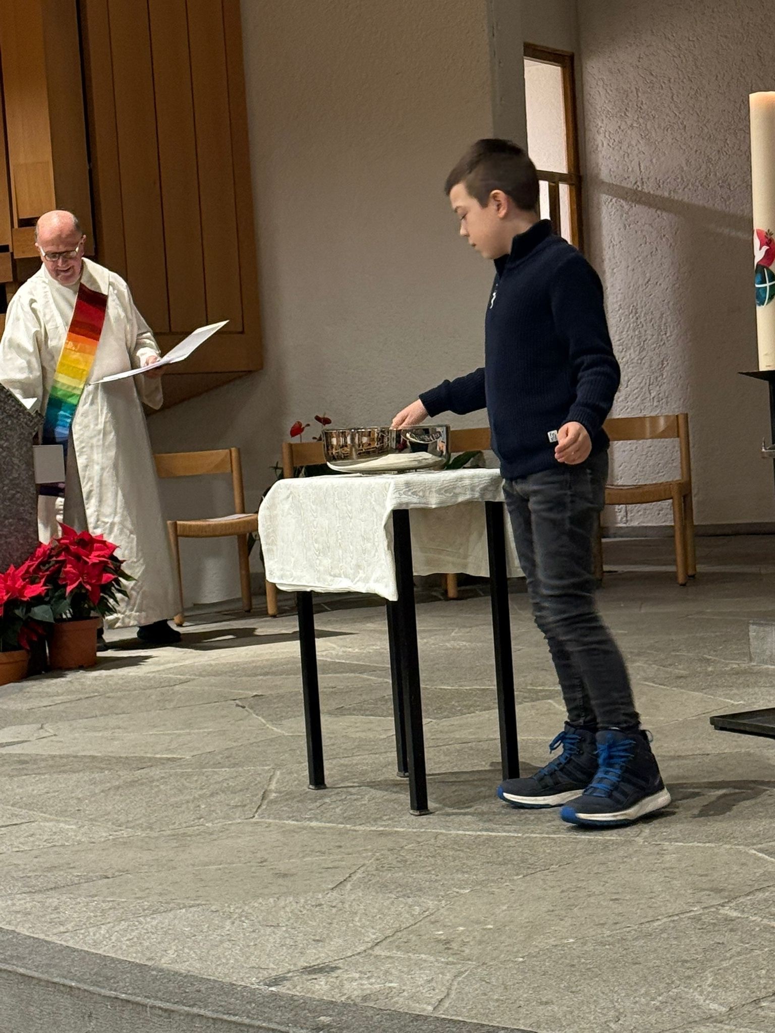 Am Samstag, 10. Januar feierten die Erstkommunionkinder ihren Tauferinnerungsgottesdienst. Eltern und Geschwister der Kinder waren auch dazu eingeladen wie auch die Taufeltern mit ihren Kindern vom vergangenen Jahr. Einzeln kamen sie nach vorne in den Altarraum und bekreuzigten sich mit Weihwasser. Sie wurden einzeln von Patricia Godena im Gottesdienst vorgestellt und dazu wurde ihre Taufkerze entzündet. Die Taufeltern entzündeten für ihre Kinder auch eine Kerze, sprachen den Namen ihres Kindes aus und steckten die Kerze in einen Sandtopf. Anschliessend sprachen alle miteinander ein kindgerechtes Glaubensbekenntnis. Taufeltern mit ihren Kindern, wie auch die Erstkommunionkinder versammelten sich rund um den Altar während des Preisgebetes und dem Vater unser. Allen Kindern, die noch keine Erstkommunion hatten machte Patricia Godena das Kreuzzeichen auf die Stirn, als Zeichen dafür, dass sie gesegnet sind. Den älteren Geschwistern und den Eltern der Tauf- und Erstkommunionkinder wurde daraufhin die Kommunion gereicht, damit sie gestärkt in ihren Alltag können. Meiner Kollegin Patricia Godena, die den Gottesdienst aktiv mitgestaltet hat, danke ich ganz herzlich. Die Erstkommunionkinder waren aktiv mit dabei. Danke allen für den gelungenen Tauferinnerungsgottesdienst.